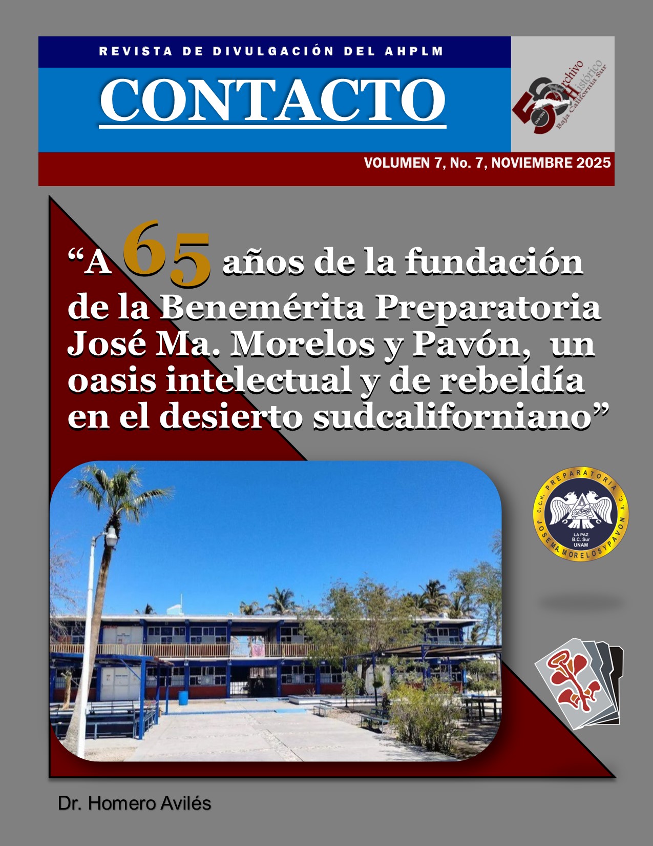 7.-CONTACTO REVISTA DE DIVULGACIÓN AHPLM, VOLUMEN 7 "A 65 años de la fundación de la Benemérita Preparatoria José Ma. Morelos y Pavón, un oasis intelectual y de rebeldía en el desierto sudcaliforniano” .